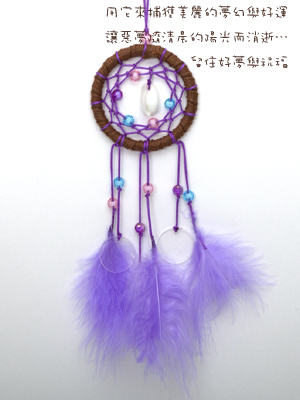 「捕夢網」源自北美印地安蘇族的護身符。通常印地安小孩做惡夢時,父母都會在其床頭上掛一個捕夢網。象徵性地用來抓住惡夢或惡夢中的魔鬼。後來在美國某些地區也流傳著這個風俗,捕夢網是象徵祈求平安;並帶來好運之意義,並可過濾惡夢,捕捉美夢,至於壞的、邪惡的部份,則自然從網心小孔濾出。所以,那是先人遺留下來的智慧,他們會在房子裡頭掛很多,作為裝飾和避邪。 圓的直徑:約6公分 總長:約20-25公分 請於備註上註明顏色喔!!(藍色、粉色、紫色)共三色