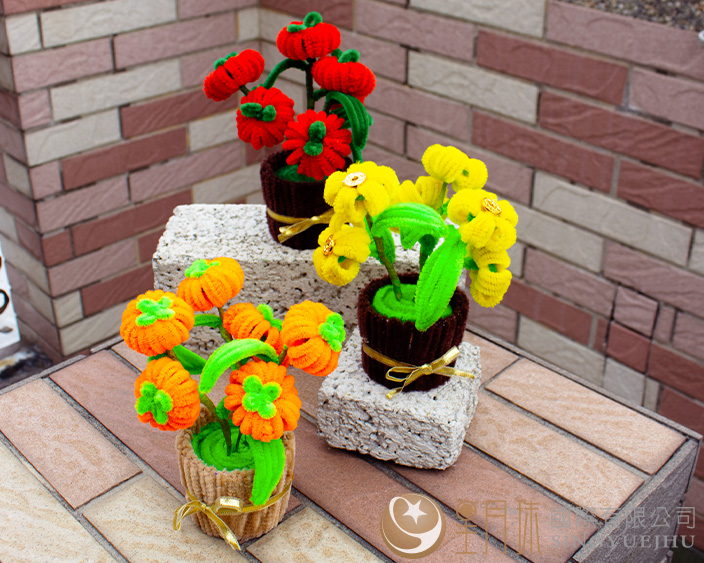 內容:毛線、彩色說明書、紙杯、緞帶、保麗龍球、綠皮鐵絲、花膠帶