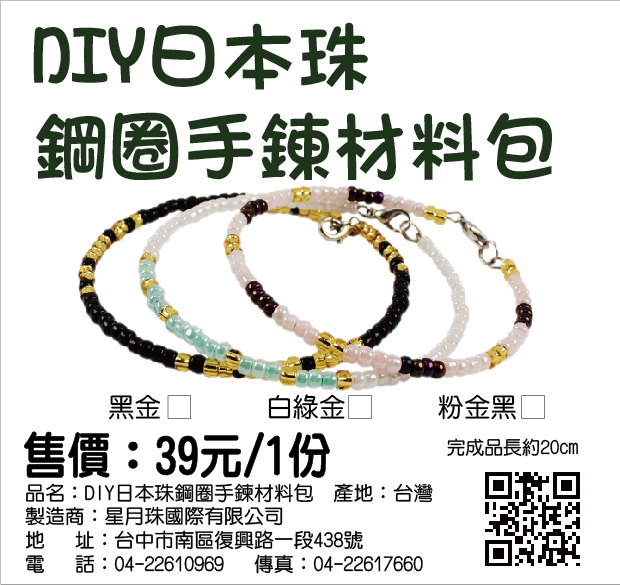 內容物: 彩色說明書, 鋼絲, 日本珠, 問號鎖扣, 鐵環