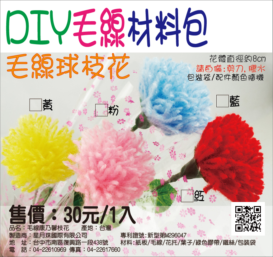 說明書,綠色鐵絲,毛線,紙板,綠色膠帶,花托,包裝袋(顏色隨機)