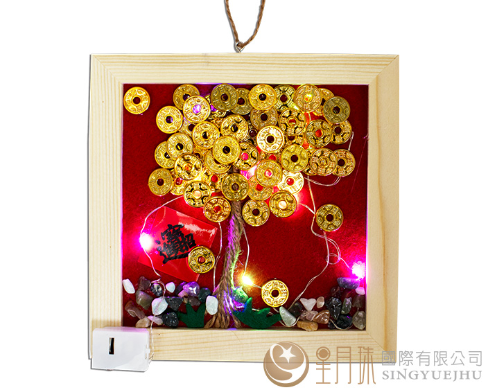 內容物:木框、塑膠錢幣、說明書、麻繩、石頭、燈、不織布
